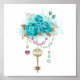 Der goldene alte Schlüssel mit trendigen türkisfarbenen Rose, die mit Blätter aus Weißgold, Rosa und Blau geschmückt sind. Modische Farbe. Türkisfarbene Rose. Weißes Gold. Blaue Krawatte.