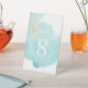 Ein türkisfarbenes, wasserfarbenes Schild mit goldfarbenem Tischnummer.