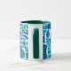 Une tasse à café blanche design avec une lèvre et une poignée verte et un motif turquoise, vert mer, bleu profond et blanc abstrait, d'un sérigraphie de Judy Adamson.