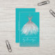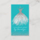 Elégante robe couturière carte de visite, avec des graphiques d'une robe de parties scintillant blanche et argent, contre un arrière - plan turquoise, avec des accents de parties scintillant argent. Personnalisez le texte en fonction de vos besoins professionnels. Une belle carte de démarcation pour votre entreprise de tailleur.