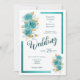 Cette belle faire-part de mariage dispose d'un bouquet de roses turquoises et turquoise avec des feuilles d'or sur un arrière - plan blanc classique.