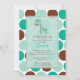 Adorable Baby Shower Einladung mit einem türkisblauen Giraffe-Set auf braunem und blauem Polka-Dot-Hintergrund. Matching Artikel in unserem Shop erhältlich. Ideal für eine Babydusche. ©Stockberry Studio