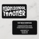 Vernetzung mit potenziellen Kunden? Verpassen Sie unsere "High School Teacher"-Visitenkarten mit weißem Typografie-Design auf schwarzem Hintergrund. Namen und Details können durch die Auswahl von "Personalisieren Sie diese Vorlage" bearbeitet werden. Wenn Sie Fragen oder Wünsche zu diesem Design haben, kontaktieren Sie uns bitte über den Chat: Wir helfen Ihnen gerne weiter!