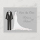 Tuxedo und Gown auf einem silbernen Hintergrund Hochzeit Speichern Sie das Datum Postkarte