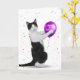 Schwarz-Weiß Katze mit lila Ballon und Konfetti auf weißem Hintergrund zum 53. Geburtstag. Die Farbe des weißen Hintergrunds kann geändert werden.
