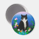 Le chat tuxedo s'assit principalement parmi les fleurs.