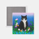 Le chat tuxedo s'assit principalement parmi les fleurs.