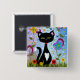 Eine schwarz-weiße Tuxedo-Katze, die zwischen dem Gras und den Blume in einem farbenfrohen Garten sitzt. Um sie herum sind Blume und Blätter und bunte Formen. Sie hat die hübschen grünen Augen und trägt einen roten Kragen.