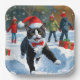 Tuxedo Katze läuft im Schnee mit Weihnachtsmütze Pappteller