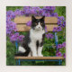 Eine niedliche schwarz-weiße bicfarbene Katze, European Shorthair, sitzend auf einem Holzstuhl vor violetten Blume. Foto von Katho Menden aufgenommen. Dieses Rätsel ist eine Geschenkidee für Katzenliebhaber.