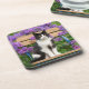 Tuxedo Katze sitzt auf einem Gartenstuhl mit Blume Getränkeuntersetzer