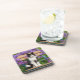 Eine niedliche schwarz-weiße bicfarbene Katze, European Shorthair, sitzend auf einem Holzstuhl vor violetten Blume. Foto von Katho Menden aufgenommen. Dieser Untersetzer ist eine Geschenkidee für Katzenliebhaber.