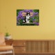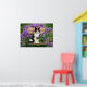 Eine niedliche schwarz-weiße bicfarbene Katze, European Shorthair, sitzend auf einem Holzstuhl vor violetten Blume. Foto von Katho Menden aufgenommen. Dieses Poster ist eine Geschenkidee für Katzenliebhaber.