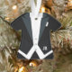 Ein passendes Memento für manch eine Gelegenheit ist diese Verzierung, die einen schwarzen Tuxedo mit weißer Krawatte, weißem KleiderShirt, weißer Weste und einem passend gefalteten weißen Taschenquadrat gerade sichtbar ist von hinten ein Revers darstellt. Auf einer unteren Ecke werden zwei Initialen gezeigt; diese werden leicht völlig redigiert oder gelöscht, wenn sie bevorzugt werden. Brautpartymitglieder, Musiker (einschließlich Leiter) und maitre d sind gerade einige der möglichen Empfänger dieses Einzelteils.