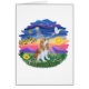 Ein Stern leuchtet auf einem Blenheimer Kavalier König Charles Spaniel herunter, der die Dämmerung genießt, während die Sonne zu Set beginnt, der Mond in den Himmel der wirbelnden Farben steigt und eine Taube über dem Kopf schwingt.