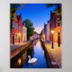 Soft sapphire skies cast gentle reflections over Bruges’ calm canals. Historic brick facades shimmer in ochre light with golden accents from street lamps, creating a serene and picturesque composition. Perfect for travel or European decor enthusiasts.