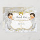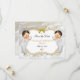 Schöne Zwillingsjungen in ihrem taufenden Anzug mit goldener Querhalskette und goldenem Kreuz. Hintergrund ist weißes Satin, goldenes filigranes, goldfarbenes und silberes Glitzer und Bugverzierung. Die Rückseite ist mit goldenen Blume auf weißem Satin-Hintergrund geschmückt.