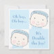 Ein süßes Design mit zwei fröhlichen Baby Jungs mit blauen und weißen Blöcken auf einer lustigen quadratischen Einladung. Ein sehr niedliches Bild für die Begrüßung von Zwillingsbabys!
