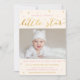 Twinkle winzige kleine Stern erste Geburtstagsfeier Einladungen für ein Mädchen, mit einem eigenen Foto von Baby-und rosa und goldenen Sternen vor einem einfachen, raffinierten cremefarbenen Hintergrund. "Twinkle, winziger kleiner Stern, ein Jahr alt ist das, was du bist!" ist in Gold und Rosa, mit den Details zum ersten Geburtstag. Sie können die Karten auch als erste Geburtstagskündigung nutzen.