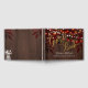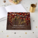 Élégant script de calligraphie or livre d'invité avec des lumières scintillantes rustiques, pot de maçon avec fleurs blanches (à l'arrière) et feuilles d'automne rouille sur arrière - plan de grange brun foncé. Idéal pour votre automne de nuit | pays rustique élégant | mariage à thème jardin extérieur.