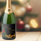 This gorgeous Merry Christmas champagne bottle label features modern gold handwritten script over twinkling lights next to a festive Christmas tree that is decorated with red and green ornaments. Customize these elegant holiday sparkling wine labels for your friends and family with personalized script over the black night sky.