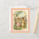 Schönes Vintage-Bild von zwei Pubs in einem schönen Garten voller Blume - Lilie des Tales und Lilie - mit einem hohen rosa Rosenstrauch hinter ihnen.