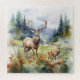 Two deer in mountain landscape with trees and flowers