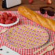 Flowers that have been arranged in sets of two are set amidst a grid of roses.