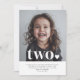 Eine Einladung zum zweiten Geburtstag mit Ihrem eigenen Foto und den Worten "zwei" über der Spitze, zusammen mit einem Herz. Sie können den gesamten Text und die Farbe des Textes und des Herzens bearbeiten.