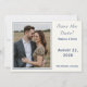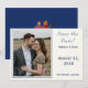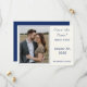Design features the photo you provide as main design displayed against a pale-cream background and framed by an elegant, navy-blue colored border. To the right of photo, your text containing heading, names and city & state of wedding are displayed in a matching navy-blue font.
