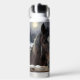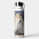 A personalized water bottle with an illustration of two horses on a snowy winter ranch with a full moon in back of them standing behind an old rustic fence.