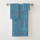Alt text: "Two images of blue towels with a geometric diamond pattern. The top image shows a towel set on a rack, and the bottom image shows a washcloth with a folded corner."