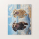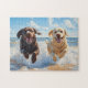 Two labrador retrievers runs towards the viewer on a sandy beach. One is yellow second is chocolate. The background features a clear blue sky with fluffy white clouds, a sparkling blue ocean with whitecaps, and a green shoreline. Perfect gift for labrador lovers.
