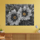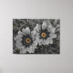 A pair of delicate daisies take centre stage in this striking selective‑colour photograph. The petals and surrounding foliage are rendered in smooth grayscale, creating a calm, monochrome backdrop. At the heart of each bloom, vivid yellow‑orange centres burst with warmth and detail, forming a dramatic contrast that immediately draws the eye. Fine water droplets rest on the petals and leaves, adding texture and a sense of freshness. The combination of soft tones and vibrant colour accents gives the artwork a modern, elegant feel that suits home décor, nature lovers, and contemporary art collections.