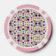 "Two poker chips with pink borders and intricate floral patterns featuring purple and pink flowers on a beige background, shown from front and back."