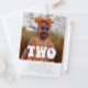 Une invitation pour le deuxième anniversaire avec votre propre photo et le mot "deux" dans une police de style super au-dessus. Parfait pour votre fête d'anniversaire à thème rétro !