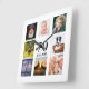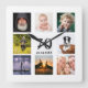 Eine Wanduhr als Geschenk für einen 70. Geburtstag für einen Typ, der sein Leben mit einer Collage von 8 eigenen Fotos feiert. Vorlagen für einen Namen, 70 Jahre und ein Datum. Geburtsdatum oder das Datum des Jahrestages. Schwarze Buchstaben. Weißer Hintergrund.