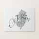 Eine Vintage Abbildung mit der Kontur-Kartenform des Staat von New Jersey, gefüllt mit einem weichen grau-Linien Textur Hintergrund und dem Namen des Staat in einem extravaganten antiken typografischen Schriftart. Dieses Kipp-Rätsel mit einem Vintagen Stil Typografie-Design der Silhouette von New Jersey mit typografischem Schriftart ist eine gute Idee für jede Familie aus dem Staat, die Lieben, zusammen zu sitzen und Rätsel am Spielabend. Mit einem kleinen Puzzle Kleber könnte dieses Ding eine Wandkunst sein, wenn man fertig ist. Vielen Dank, dass Sie sich dieses coole Puzzle im Stil der Kalligraphie an der alten Schule anschauen, wir sind sehr dankbar. Ein Vintages Design des Staat von New Jersey mit typografischem Schriftart.