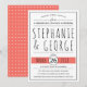 Moderne Schwarz-Weiß-Typografie Hochzeit Probe Dinner Einladung mit lebendigen Korallenfarben betont. Es zeigt den Text in Schwarz auf Weiß und das Datum Ihres Hochzeitsmahls auf einem Korallenbanner an. Es gibt einen schwarzen Rahmen. Auf der Rückseite befindet sich ein Muster mit weißen Kreuzen auf der Koralle. Alles auf dieser Einladung ist bearbeitbar.