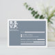 Faites des réponses sans effort avec cette carte RSVP de mariage élégante et audacieuse, stylisée en bleu ardoise et accentuée par un texte blanc clair et minimaliste. La disposition verticale simple et contemporaine s'harmonise parfaitement avec les invitations de mariage modernes avec une date verticale saisissante. La typographie audacieuse occupe le devant de la scène, donnant un aspect élégant et lourd de type qui semble à la fois tendance et fonctionnel. L'espace et la mise en forme rationalisée rendent la réponse simple pour vos invités, tandis que le design minimaliste général garantit que votre suite reste élégante et sophistiquée. Parfait pour les couples qui apprécient une réponse mariage bleue r.s.v.p avec une pointe moderne, cette carte réunit l'esprit contemporain et la facilité d'utilisation sans effort dans une pièce élégante.