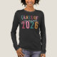 Black graduation sweater with a typography design in teal, pink, dark red, and yellow. Class of 2026, with senior written across in a white script.