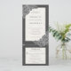 Florweiße Pappkuchen auf einem grauen strukturierten Hintergrund Hochzeitseinladung Kombination. Die Antwortkarte ist eine abgeschnittene Postkarte mit Wahlmöglichkeiten. Eine moderne, alles in einer Lösung, um zu verhindern, dass die beiliegende rsvp-Karte versehentlich unter den Kühlschrank kommt. Auf der Rückseite der Einladung gibt es eine optionale Details Information. *Das Design kann mit verschiedenen Schriftart, Farben oder Papiertypen personalisiert werden.