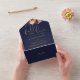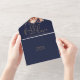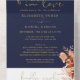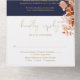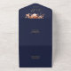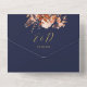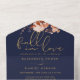 Alles in einer Hochzeitseinladung mit rustikalen Blumen und eleganter Goldkalligraphie-Schrift Typografie auf marinebasischem Hintergrund. Die Einladung enthält zusätzliche Gastdetails und eine perforierte RSVP-Karte, die für Sie individuell adressiert oder verlassen werden kann, damit Sie die Adressdaten Ihres Gastes handschreiben können. Entwickelt von Thisisnotme©