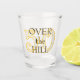 Über den Hügel-Shotglas. Fügen Sie sein oder ihr Alter hinter der Formulierung "über den Hügel" ein. Text ist dunkelbraun-schwarz mit orangem Schatten. Die Zahlen sind hellgrau mit orange-gelb umrandet.