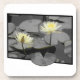 Dieses Bild zeigt zwei zarte Wasserlilien in sanften, blassgelben Farbtönen, die vor einem Hintergrund von gedämpften, graustufigen Lilienpolstern und Wasser lebhaft stehend werden. Die Blume reichen über den schwarzen Rahmen hinaus und erzeugen einen dynamischen, fast dreidimensionalen Effekt. Der Kontrast zwischen den pulsierenden Blüten und der gedämpften Umgebung unterstreicht die sanfte Schönheit und Ruhe der Szene, die ein Gefühl der Ruhe und Eleganz hervorruft.