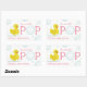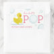 Ein Babyduschaufkleber mit dem Text "sie ist im Begriff, POP zu machen" mit der Abbildung einer Blase, die in das Design integriert ist, und einer Abbildung einer gelben Gummiente. Personalisieren Sie den Namen. Entsprechende Einladungen und andere Gegenstände sind in der Jill's Paperie erhältlich.