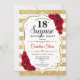 Überraschung 18. Geburtstag Einladung. Weiblich, rotes Design mit Imitaten Glitzer Gold. Enthält Streifen, rote Rosen, Skript-Schriftart und Konfetti. Ideal für eine elegante Geburtstagsfeier. Kann personalisiert sein, jedes Alter zu zeigen. Nachricht, wenn Sie weitere Anpassungen benötigen.