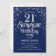 Überraschung 21. Geburtstag Party Einladung. Elegantes Design in Marineblau und Imitate Glitzer Silber. Features stilvolle Skript-Schriftart und Konfetti. Nachricht, wenn du ein Alter brauchst.
