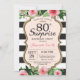Überraschung 80. Geburtstag Einladung für Frauen. Black and Gold Geburtstagsparty Einladung. Gold Glitzer. Rosa Aquarell Floral Blume. Schwarze und weiße Streifen. Printable Digital.Für weitere Anpassungen klicken Sie bitte auf die Schaltfläche "Anpassen" und verwenden Sie unser Designwerkzeug, um diese Vorlage zu ändern.