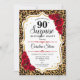 Überraschung 90. Geburtstag Einladung. Weibliches, weißes Design mit Imitaten Glitzer Gold. Features Tier Leopard Geparden Geparden, rote Rosen, Skript-Schriftart und Konfetti. Ideal für eine elegante Geburtstagsfeier. Kann personalisiert sein, jedes Alter zu zeigen. Nachricht, wenn Sie weitere Anpassungen benötigen.